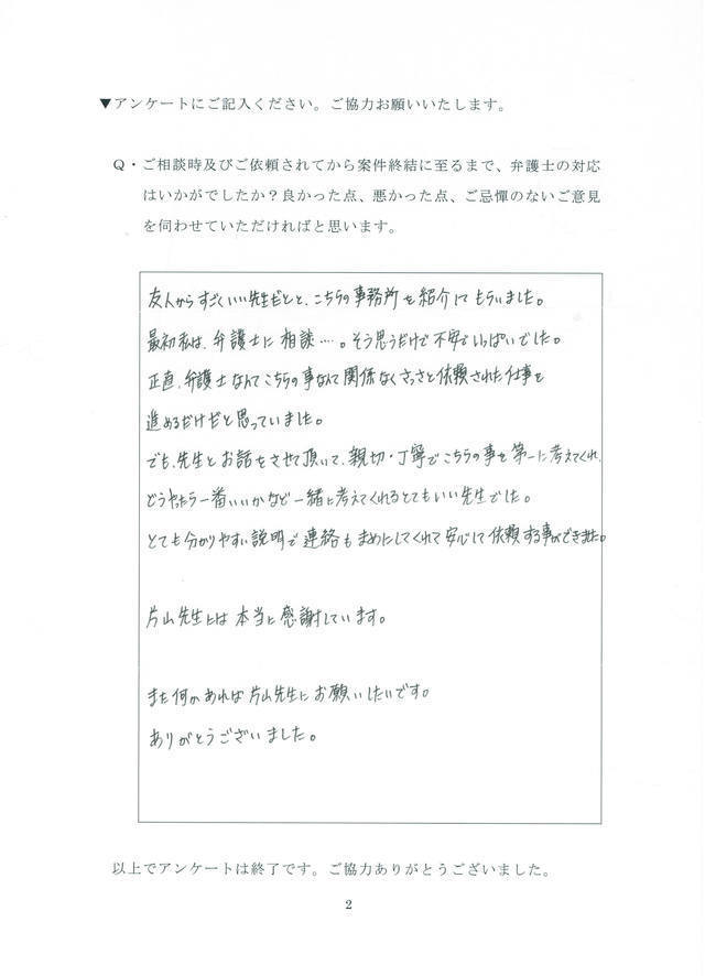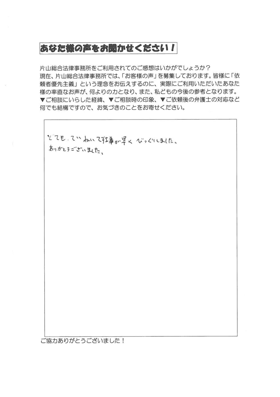メールで連絡が来るのも、随時分かり易く、細かく連絡頂き、依頼に伺った当日から尽力してくれていました。11月7日に片山先生に依頼に行って、今日は12月14日、もう解決して返金手続きの用紙を記入しています。