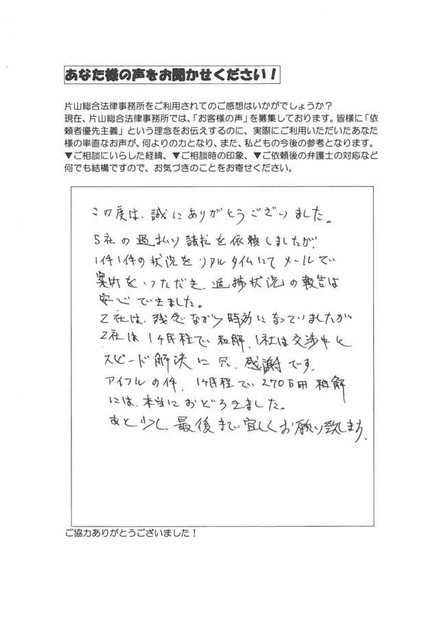 アイフルに対する過払い金請求をお考えで、「過払い金スピード解決」を望まれる方は、弁護士がたくさんいるような大量処理型事務所ではなく、過払い金に強い所長弁護士が全件担当する名古屋駅の弁護士・片山総合法律事務所までご相談・ご依頼ください。