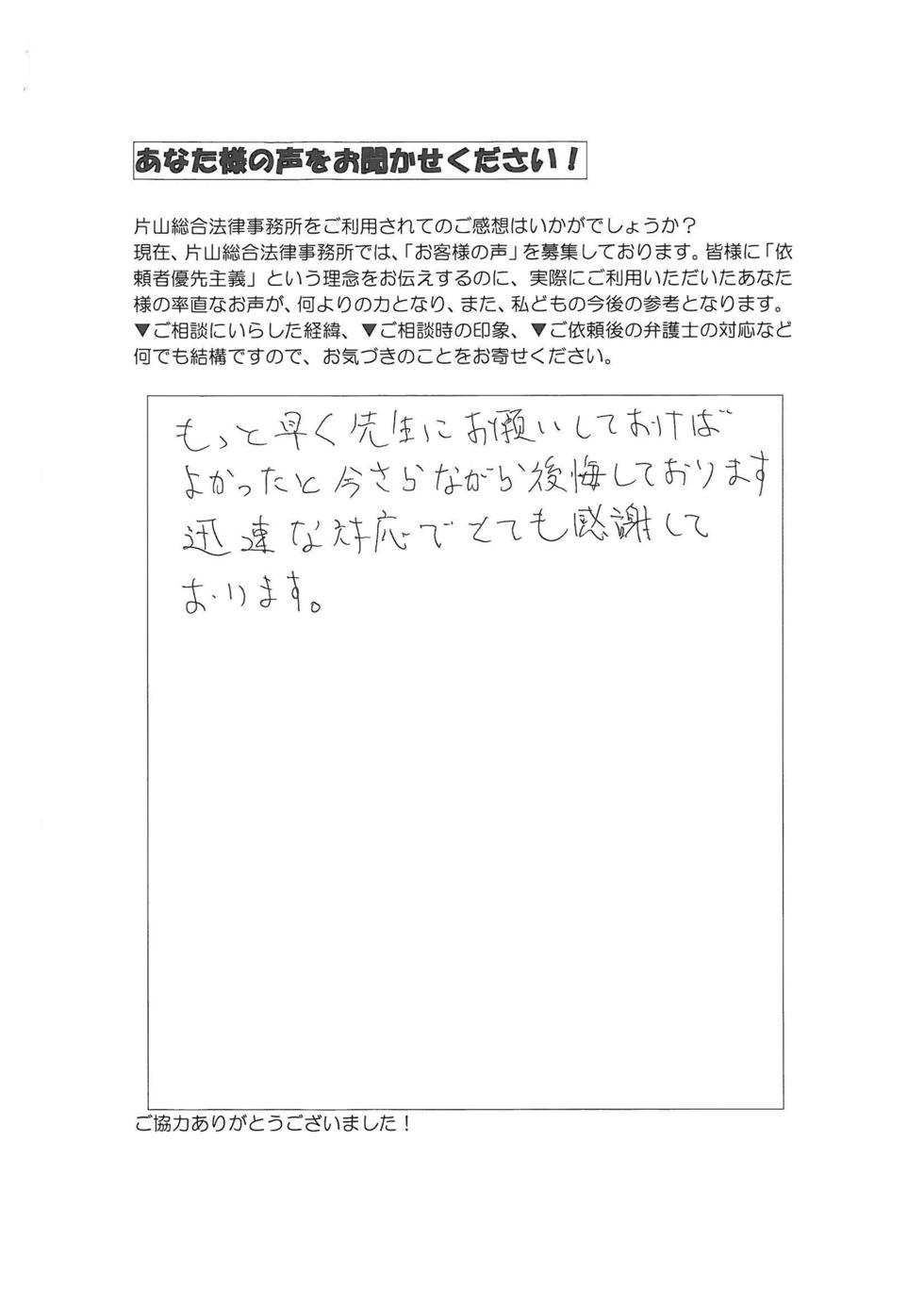 また、和解に際しても、「事務所方針だから1円も減額しない」という押しつけはしません。ご本人様が納得できる金額で和解を進めて、早期解決を図ることもできます。いずれにしても、「ご本人のご希望」を最優先にしています。