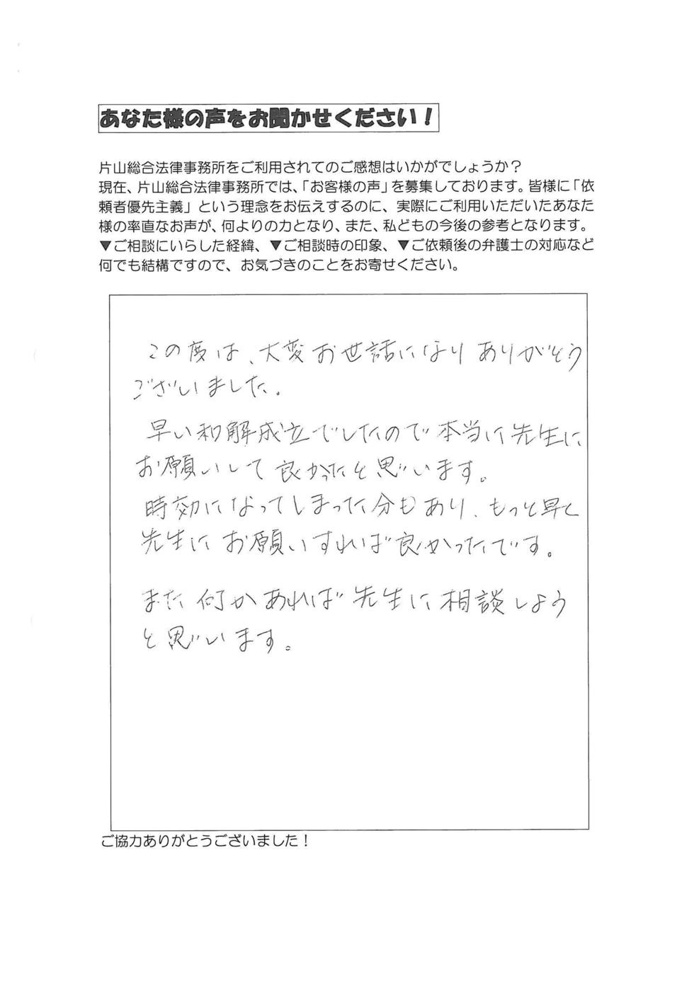 和解迄の期間も、当初説明を聞いた期間より、ずっと早く解決出来、連絡を頂いた時はとてもびっくりしました。