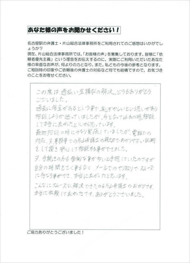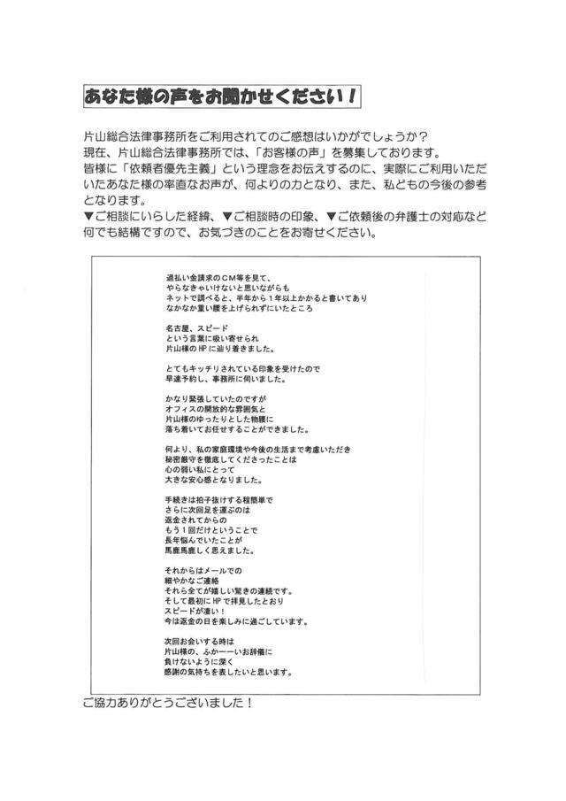 過払い金請求のCMを見て、やらなきゃいけないと思いながらも、ネットで調べると、半年から1年以上かかると書いてあり、なかなか重い腰をあげられずにいたところ、名古屋、スピードという言葉に吸い寄せられ、片山様のHPに辿り着きました。