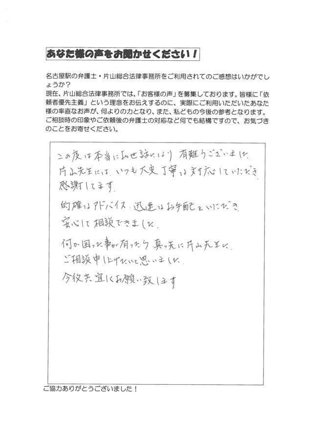 こちらでご紹介させていただいております「お客様の声」は、数多くある弁護士事務所・司法書士事務所から、名古屋駅の弁護士・片山総合法律事務所をお選びいただいた方々のお一人お一人の生の声です。