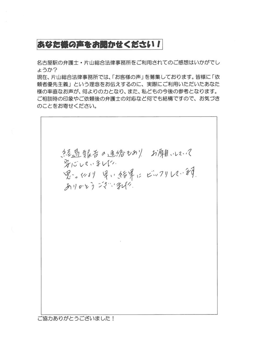こちらでご紹介させていただいております「お客様の声」は、数多くある弁護士事務所・司法書士事務所から、名古屋駅の弁護士・片山総合法律事務所をお選びいただいた方々のお一人お一人の生の声です。