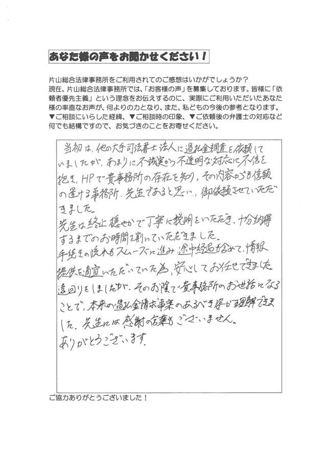 でも、相談時の丁寧なわかりやすい説明(複数ある過払い金の請求の会社の1件ずつをわかりやすく説明)、依頼者優先主義の理念どおり、依頼者に寄り添い、私の身になって何が一番良いかということを、こちらに聞きながらお話しして下さり、安心して相談し、依頼出来ました。