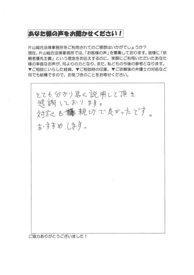 片山先生にお会いして、相談してみましたら、とても好印象で、何も分からない私に理解できる様、分かりやすく、丁寧な説明で対応して頂き、いつも感謝しておりました。