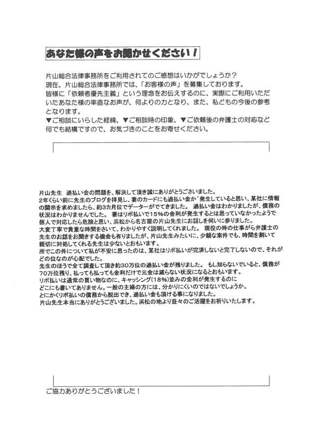 2年くらい前に先生のブログを拝見し、妻のカードにも過払い金が発生していると思い、某社に情報の開示を求めましたら、約3カ月位でデータが出てきました。過払い金はわかりましたが、債務の状況はわかりませんでした。妻はリボ払いで15%の金利が発生するとは思っていなかったようで、個人で対応したら危険と思い、浜松から名古屋の片山先生にお話を伺いに参りました。