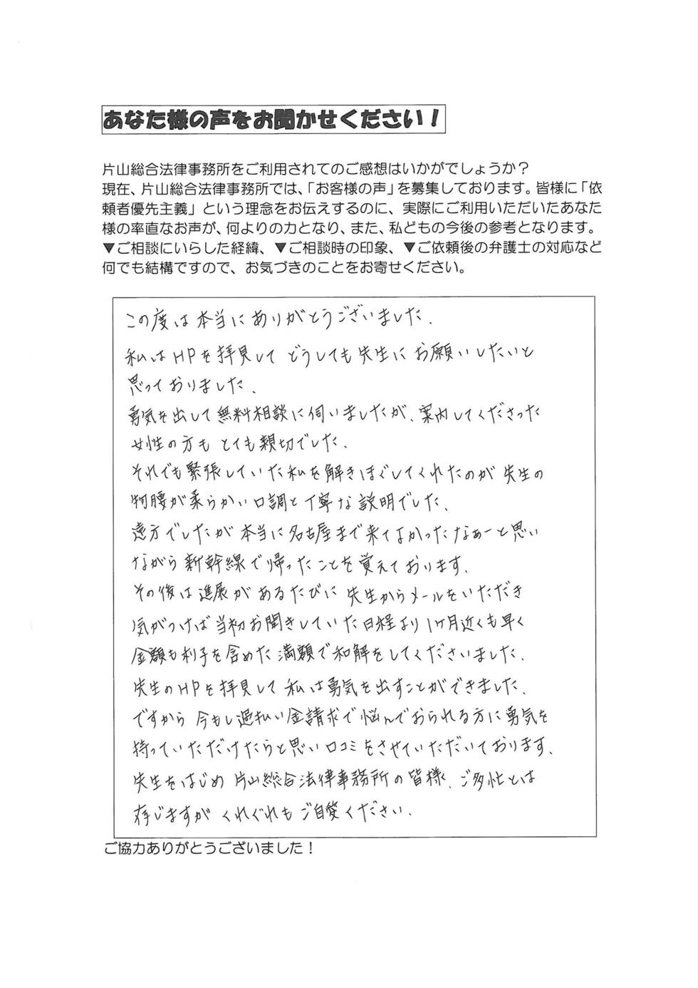 実際、弁護士という立場の方と対面する緊張感はあったものの、それを払拭するぐらいの対応や説明も丁寧で、名古屋行きも1回で済み、解決までもスムーズでスピード感もあり、まさに困っている弱者の味方という認識を強くしました。