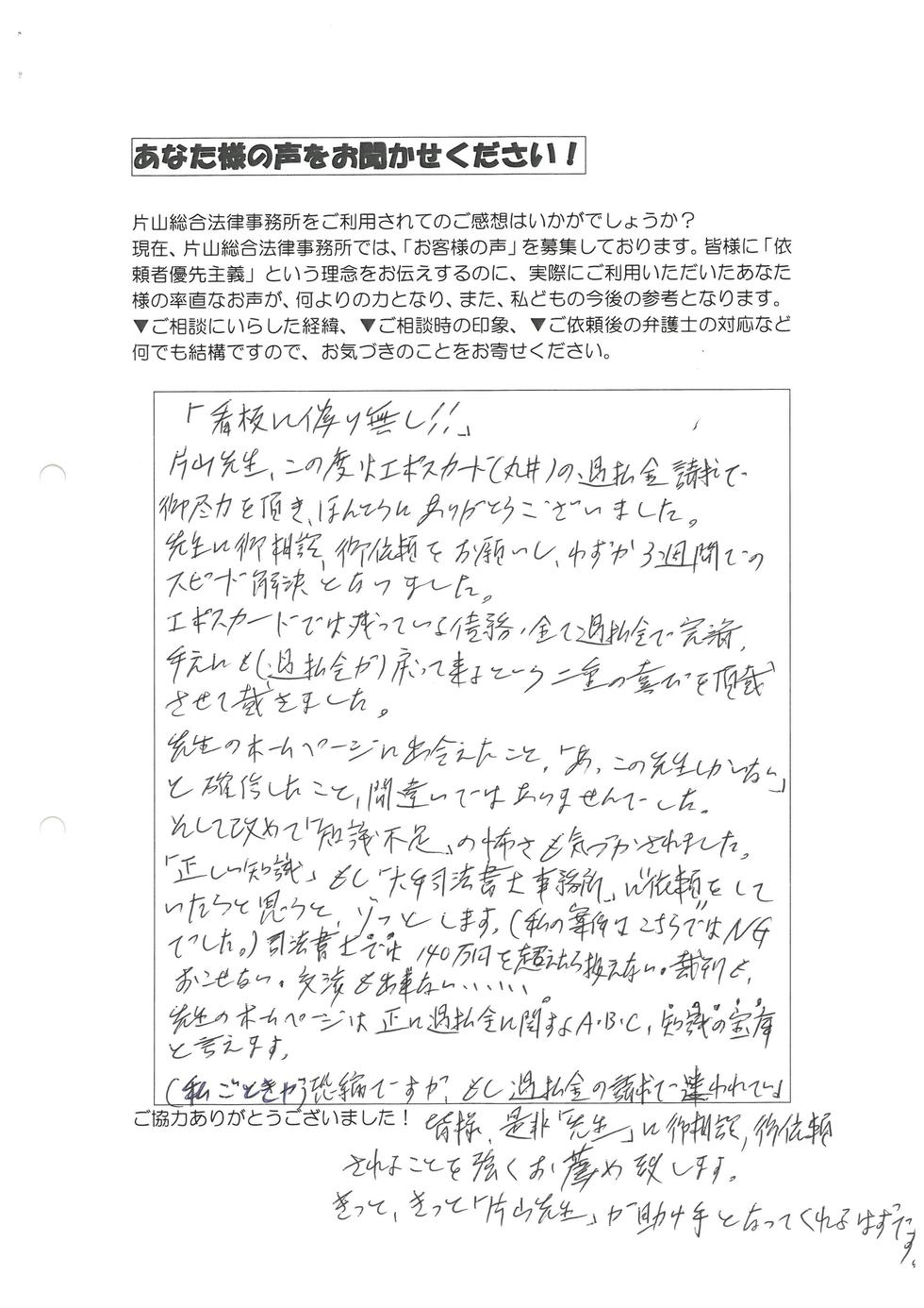 片山先生、この度は、エポスカード(丸井)の過払金請求で御尽力を頂き、本当にありがとうございました。