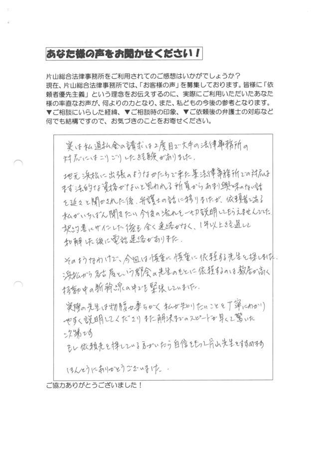 大変丁寧で貴重な時間をさいて、わかりやすく説明してくれました。現役の時の仕事柄、弁護士の先生のお話をお聞きする機会も有りましたが、片山先生にみたいに、少額な案件でも、時間を割いて親切に対処してくれる先生は少ないと思います。
