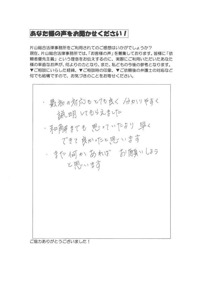 人と話すのが少々苦手な私に、先生の方から請求の進め方等を分かりやすく説明していただき、今まであった不安がなくなり、安心して依頼する事ができました。