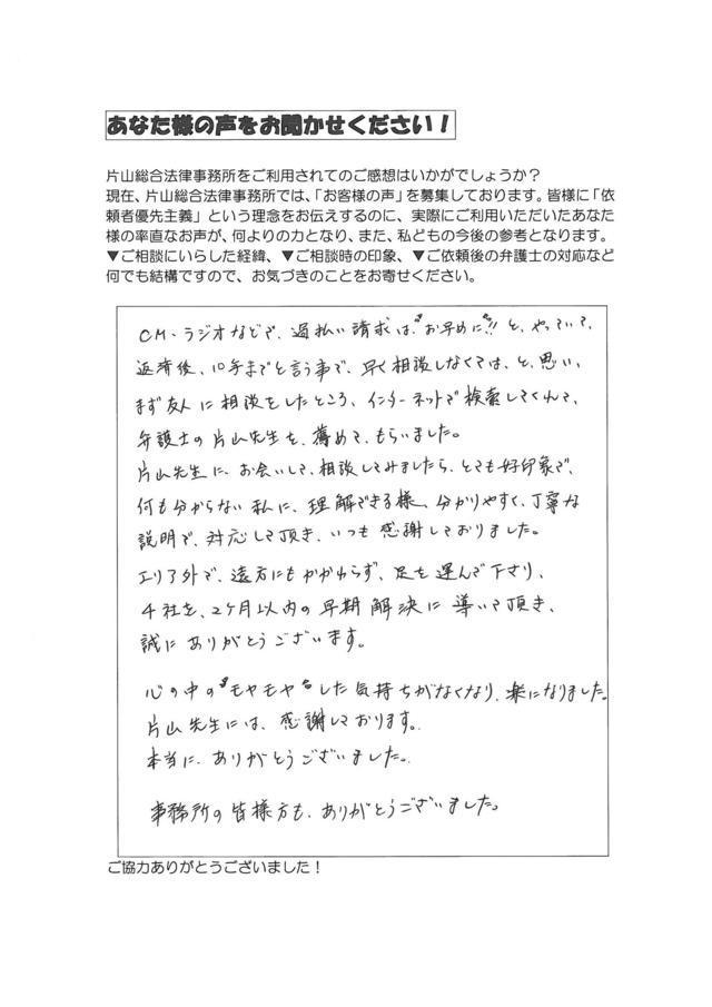 CM・ラジオなどで、過払金請求は「お早めに!!」とやっていて、返済後10年までと言う事で、早く相談しなくては、と思い、まず友人に相談したところ、インターネットで検索してくれて、弁護士の片山先生を勧めてもらいました。
