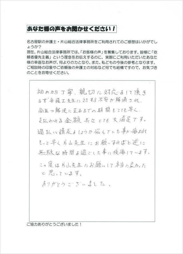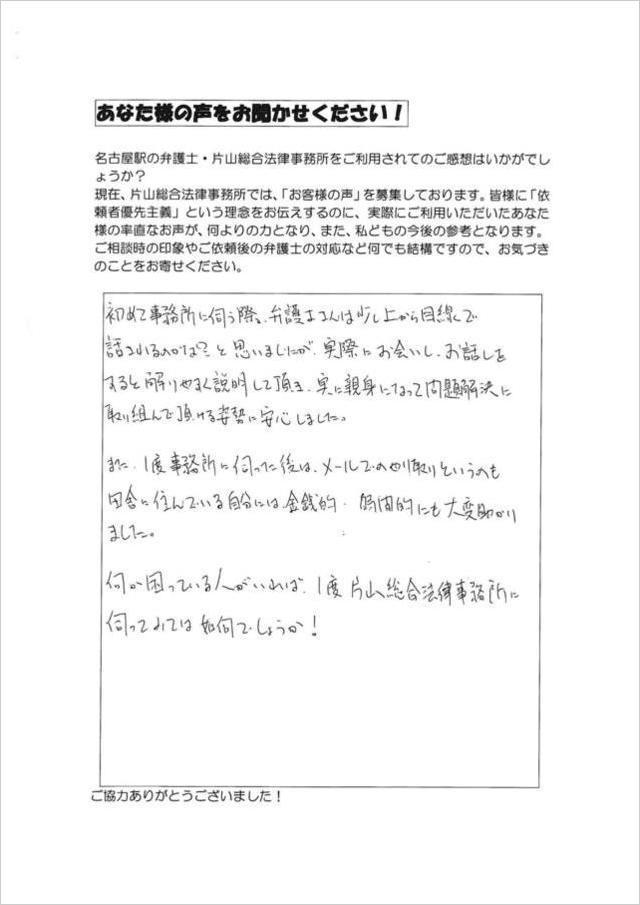 初めての法律事務所ですごく緊張(不安)しておりましたが、片山先生の親切でわかりやすい説明を聞き、お願いしようと思いました。