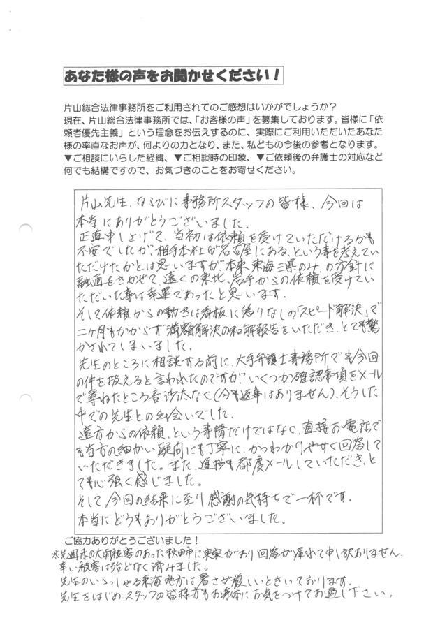 金額も他の事務所より高い割合で交渉してもらい、まさに「スピード解決」を実感しました。