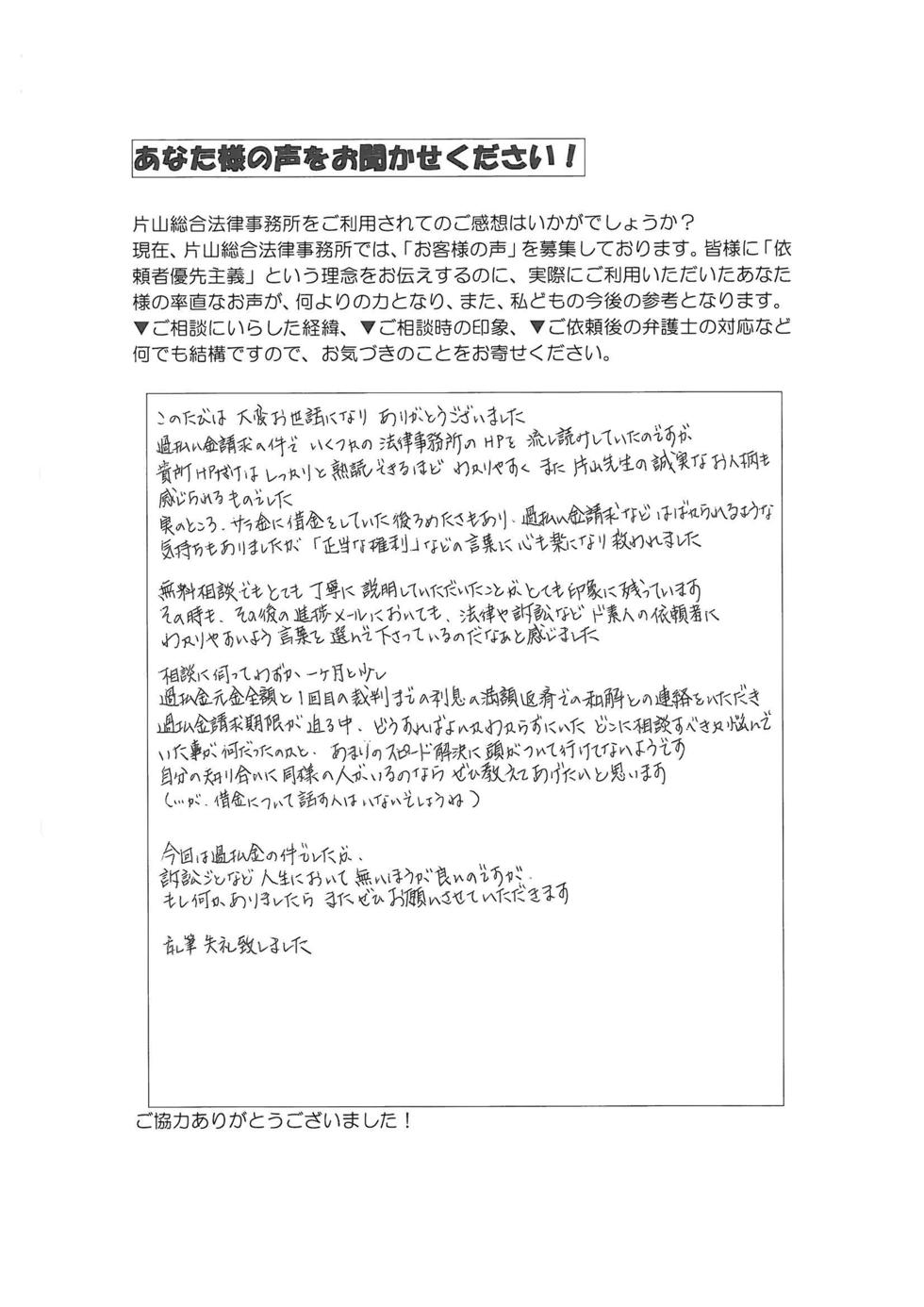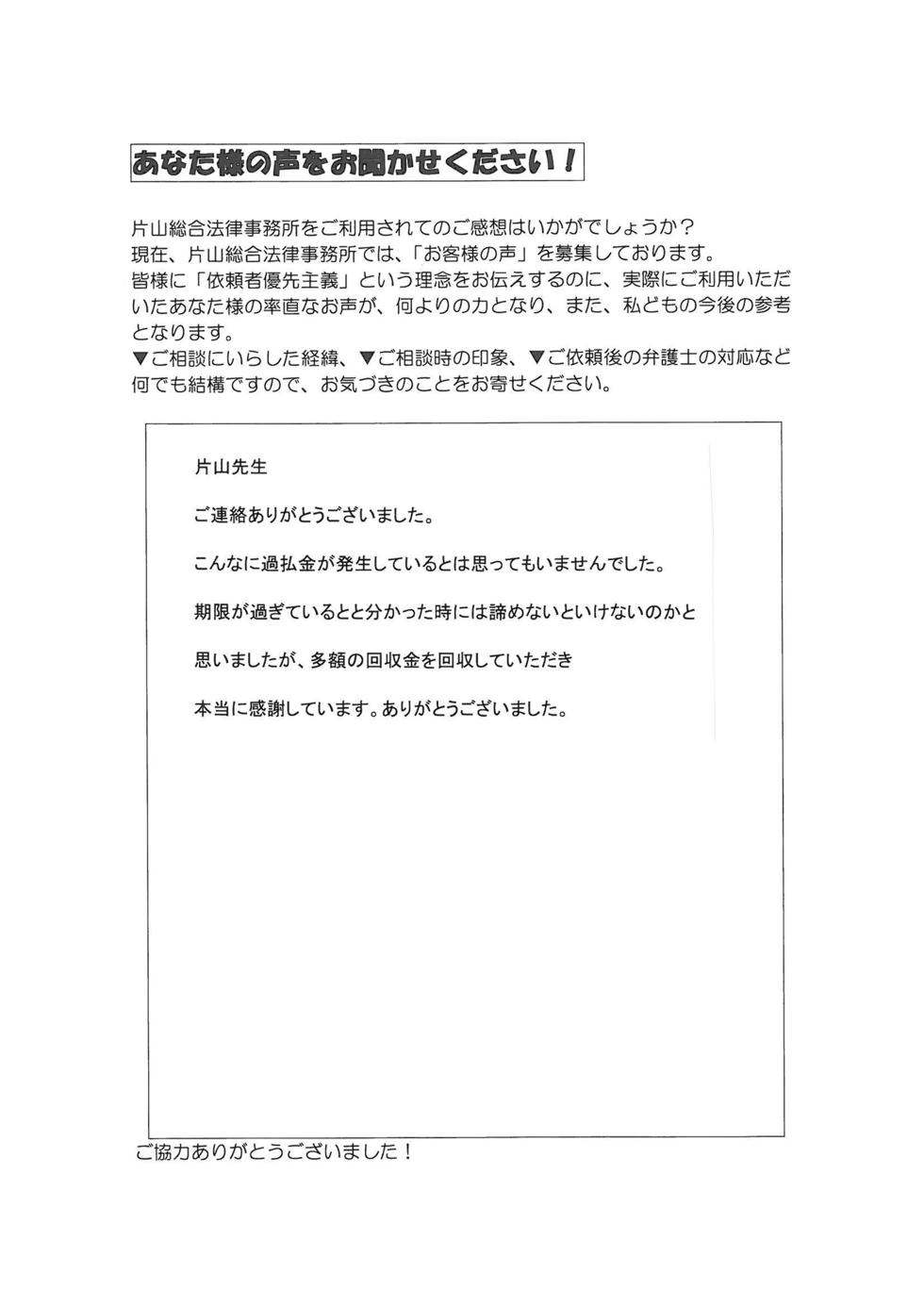 過払い金請求の件で、いくつかの法律事務所のHPを流し読みしていたのですが、貴所HPだけはしっかりと熟読できるほどわかりやすく、また片山先生の誠実なお人柄も感じられるものでした。