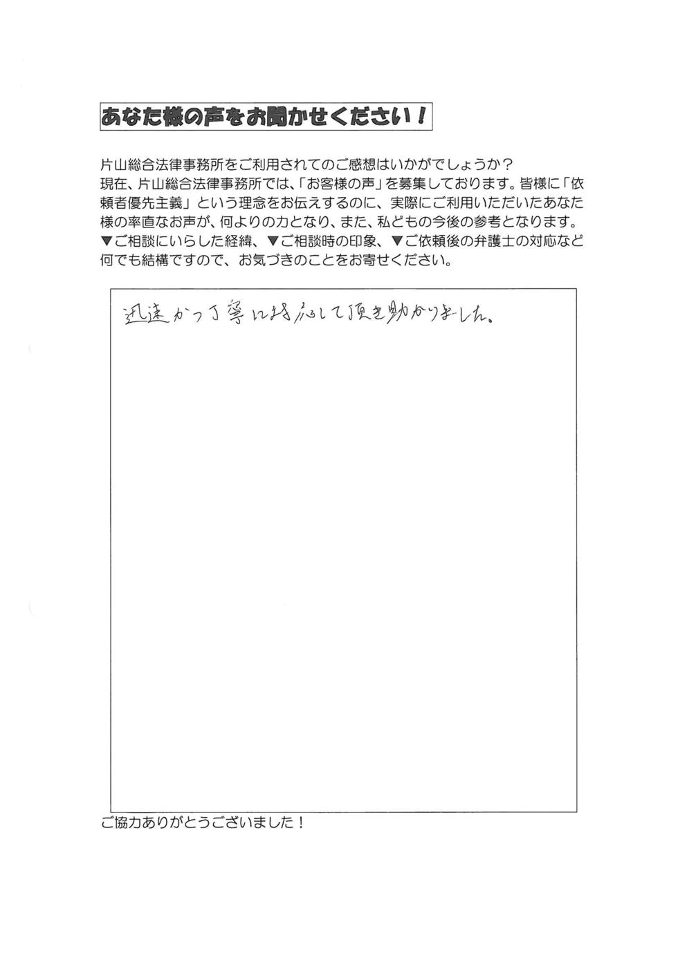 こちらでご紹介させていただいております「お客様の声」は、数多くある弁護士事務所・司法書士事務所から、名古屋駅の弁護士・片山総合法律事務所をお選びいただいた方々のお一人お一人の生の声です。