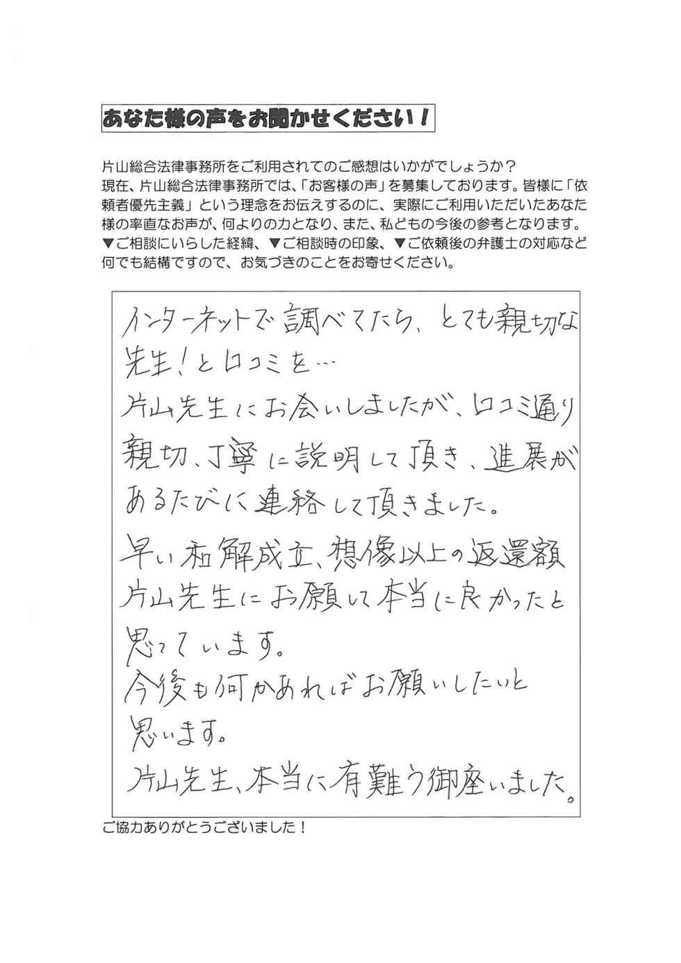 この度の過払金請求の件では、大変お世話になり、ありがとうございました。