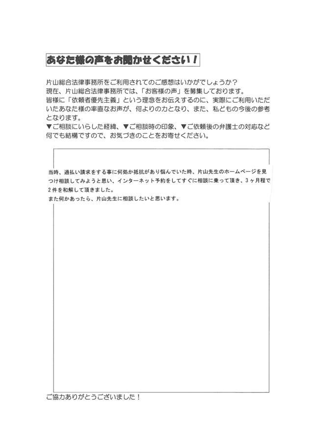 もとより弁護士の方にお願いするつもりでしたが、片山先生を選んだのは、HPを見て、地域密着で1人1人に丁寧な対応をして下さると評判でしたので、選びました。