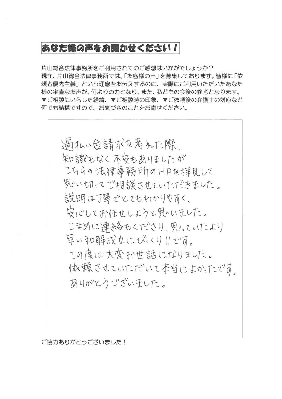 初めての法律事務所ですごく緊張(不安)しておりましたが、片山先生の親切でわかりやすい説明を聞き、お願いしようと思いました。