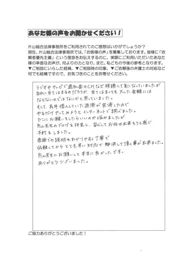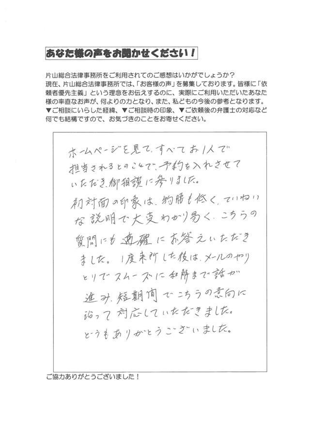 こちらでご紹介させていただいております「お客様の声」は、数多くある弁護士事務所・司法書士事務所から、名古屋駅の弁護士・片山総合法律事務所をお選びいただいた方々のお一人お一人の生の声です。