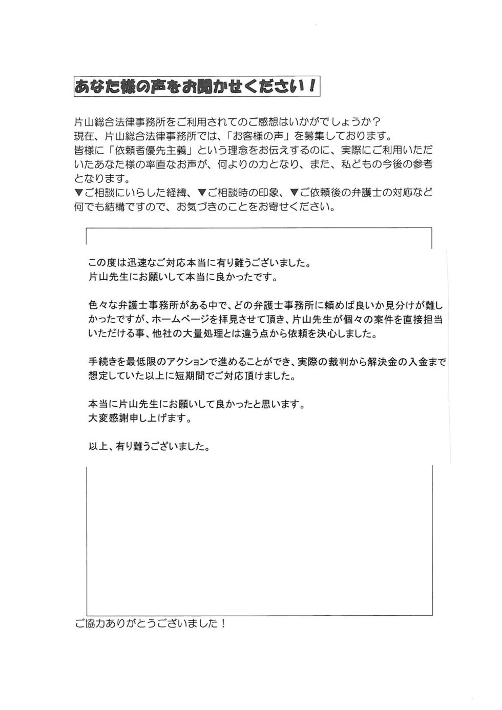 片山総合法律事務所様に依頼して、本当に良かったと心から感謝致しております。ありがとうございました。