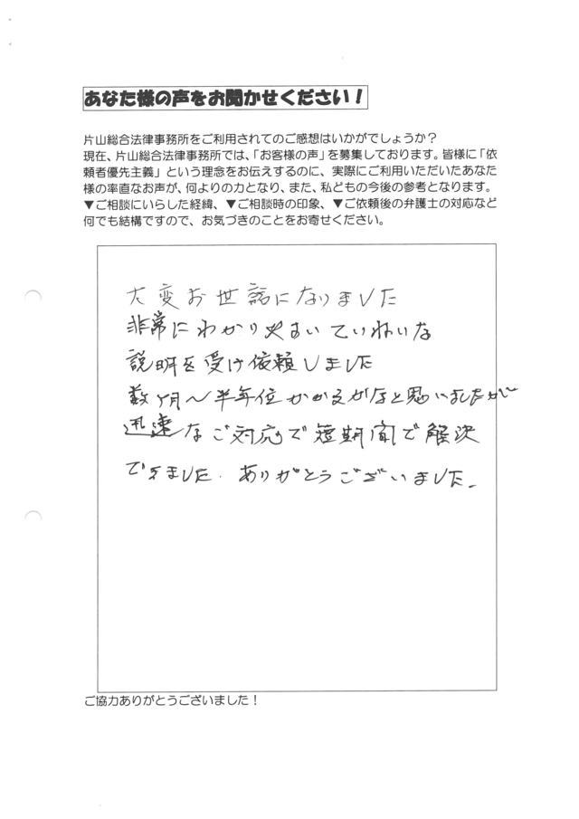 こちらでご紹介させていただいております「お客様の声」は、数多くある弁護士事務所・司法書士事務所から、名古屋駅の弁護士・片山総合法律事務所をお選びいただいた方々のお一人お一人の生の声です。