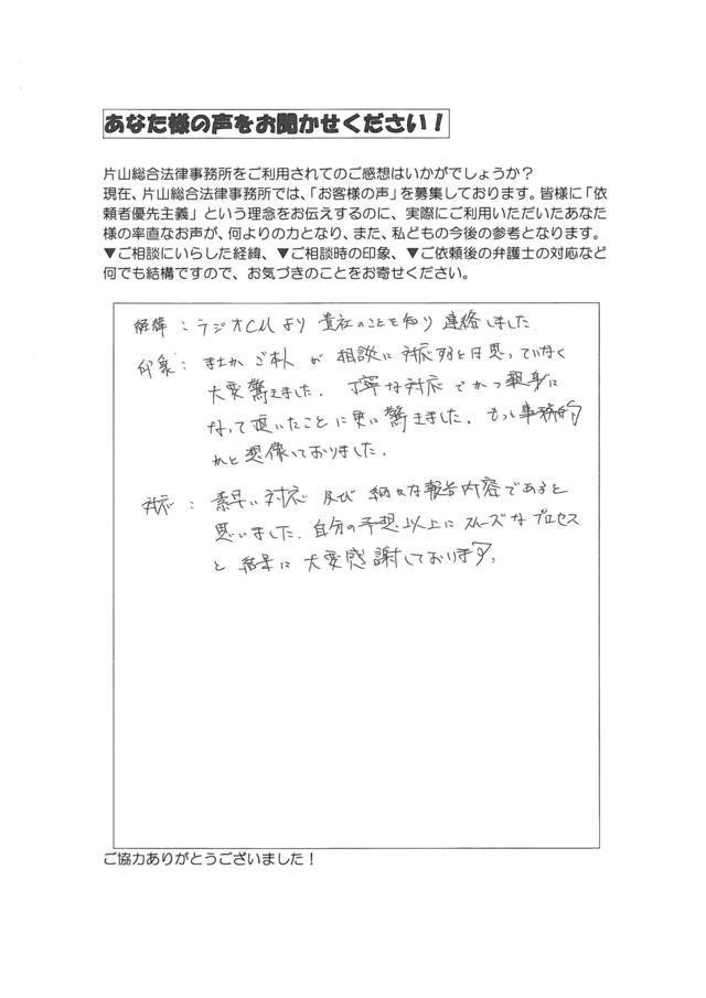 こちらでご紹介させていただいております「お客様の声」は、数多くある弁護士事務所・司法書士事務所から、名古屋駅の弁護士・片山総合法律事務所をお選びいただいた方々のお一人お一人の生の声です。