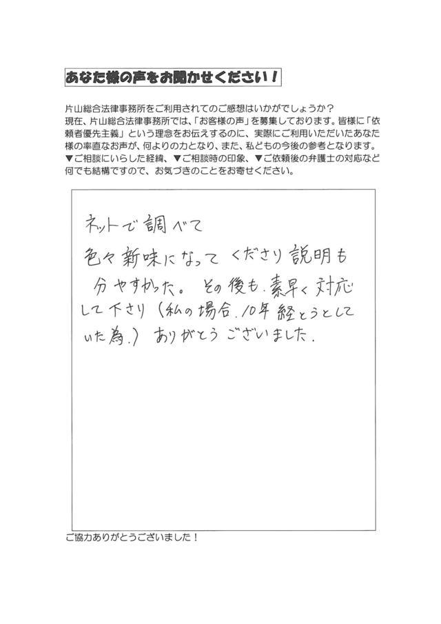 こちらでご紹介させていただいております「お客様の声」は、数多くある弁護士事務所・司法書士事務所から、名古屋駅の弁護士・片山総合法律事務所をお選びいただいた方々のお一人お一人の生の声です。