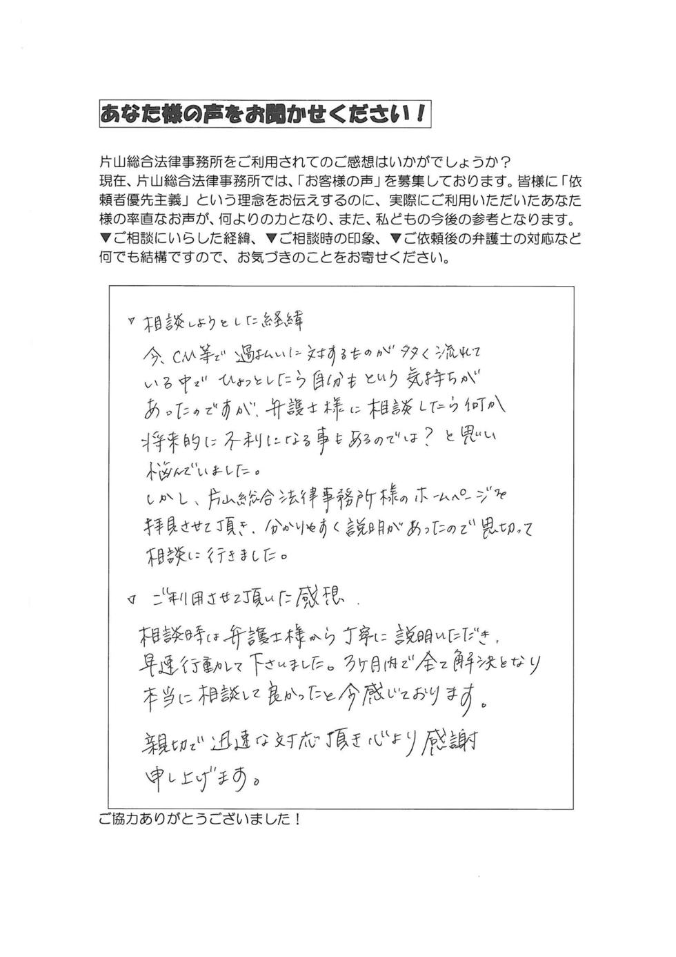 こちらでご紹介させていただいております「お客様の声」は、数多くある弁護士事務所・司法書士事務所から、名古屋駅の弁護士・片山総合法律事務所をお選びいただいた方々のお一人お一人の生の声です。