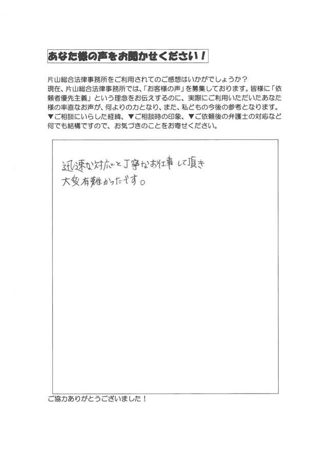 こちらでご紹介させていただいております「お客様の声」は、数多くある弁護士事務所・司法書士事務所から、名古屋駅の弁護士・片山総合法律事務所をお選びいただいた方々のお一人お一人の生の声です。