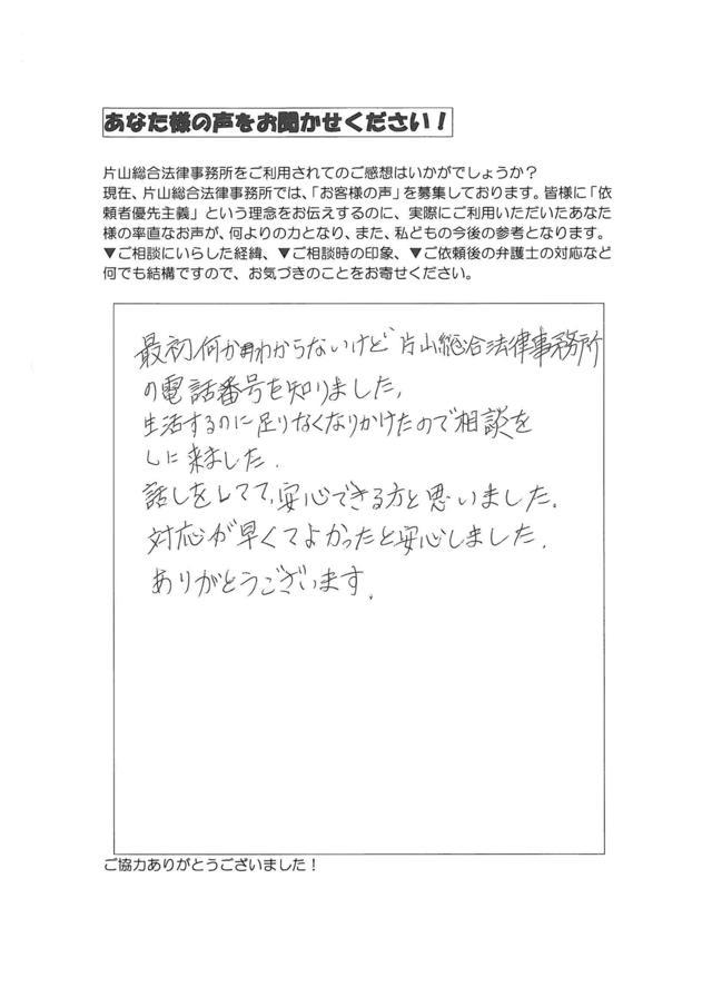 こちらでご紹介させていただいております「お客様の声」は、数多くある弁護士事務所・司法書士事務所から、名古屋駅の弁護士・片山総合法律事務所をお選びいただいた方々のお一人お一人の生の声です。