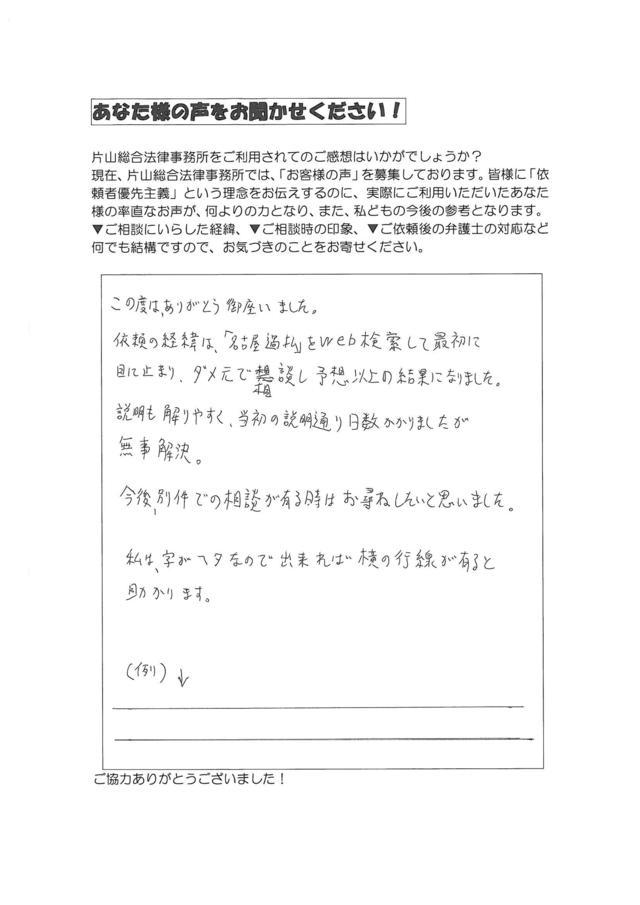 こちらでご紹介させていただいております「お客様の声」は、数多くある弁護士事務所・司法書士事務所から、名古屋駅の弁護士・片山総合法律事務所をお選びいただいた方々のお一人お一人の生の声です。