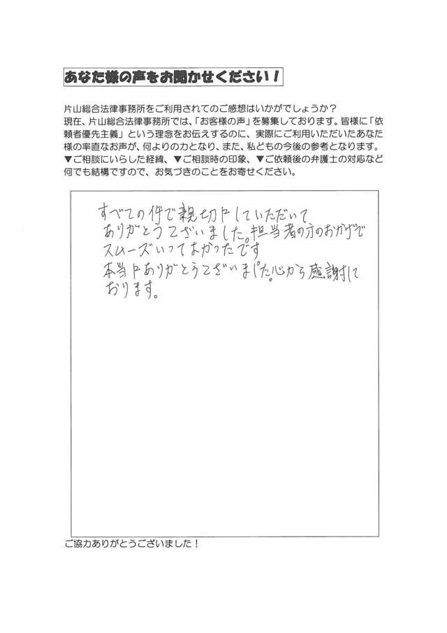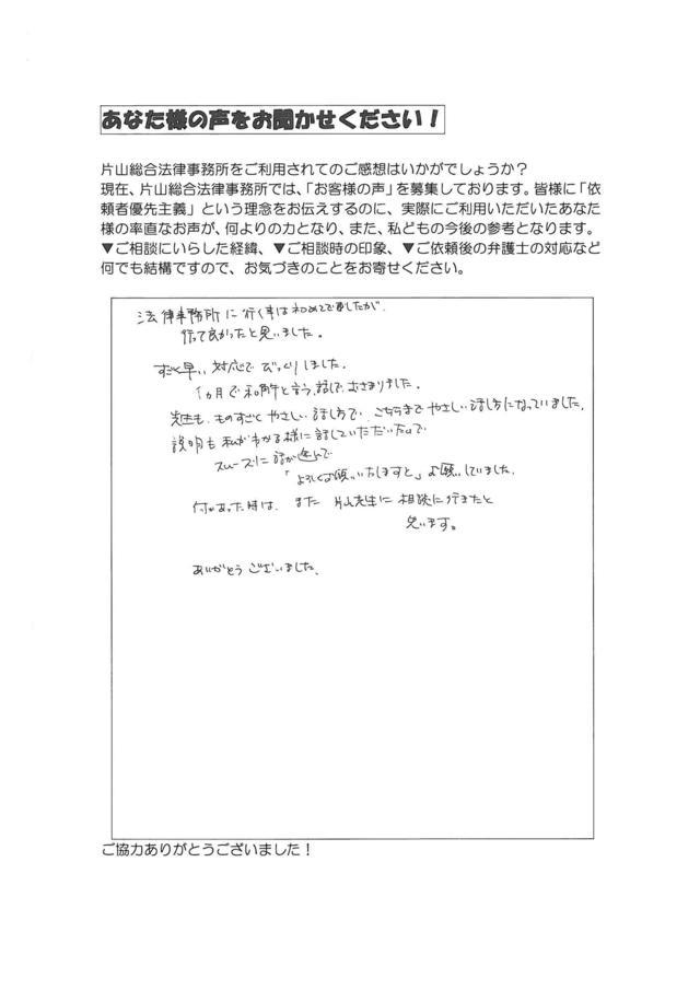 こちらでご紹介させていただいております「お客様の声」は、数多くある弁護士事務所・司法書士事務所から、名古屋駅の弁護士・片山総合法律事務所をお選びいただいた方々のお一人お一人の生の声です。