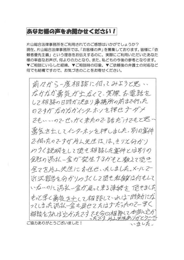 こちらでご紹介させていただいております「お客様の声」は、数多くある弁護士事務所・司法書士事務所から、名古屋駅の弁護士・片山総合法律事務所をお選びいただいた方々のお一人お一人の生の声です。