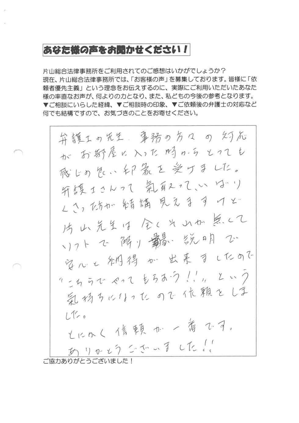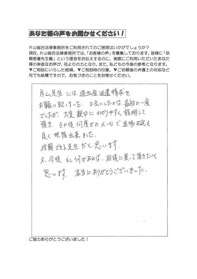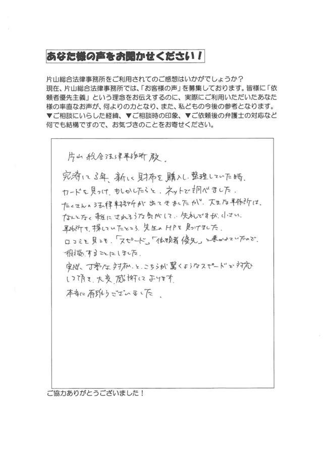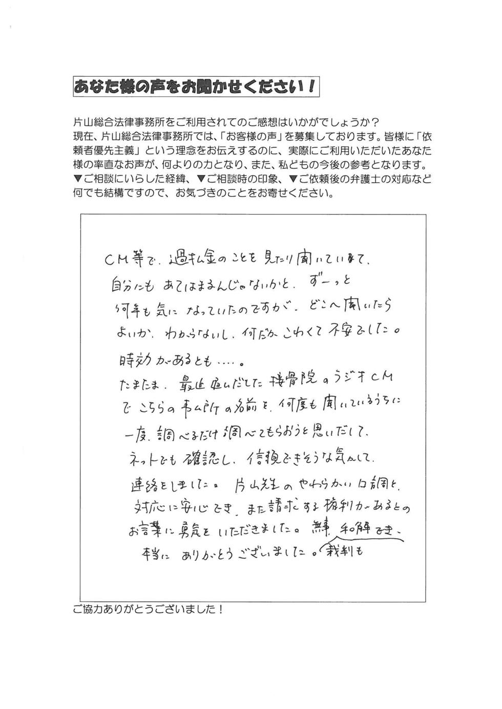 借金をずっと繰り返し、収入は多いのに、ギャンブル・浪費で、市県民税を滞納したり、借金も首が回らなくなって、債務整理をするのは嫌だったので、過払請求は完済していればブラックリストにのらないと聞き、インターネットで探してもなかなか決められず、CMでやっている大手は何か信用できず、3日ぐらいかかり、片山先生のHPを見つけ、スピーディーさなど、私は勘が良いので、ピンときて、決めました(写真で先生少し怖く見えたので、悩みましたが(笑))。