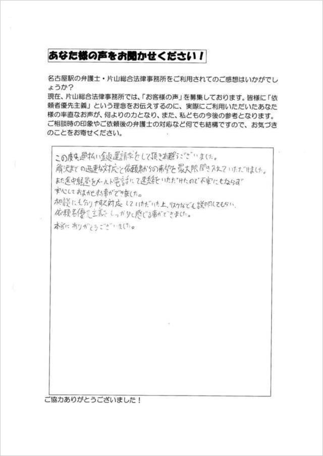 長年支払い続けた借金を完済し、過払い金請求をしようとインターネットのホームページで弁護士事務所を探している時に、片山総合法律事務所の「依頼者優先主義」というモットーにひかれ、また、実際に依頼された方の声を拝見させて頂いて、ここに依頼しようと決めさせて頂きました。