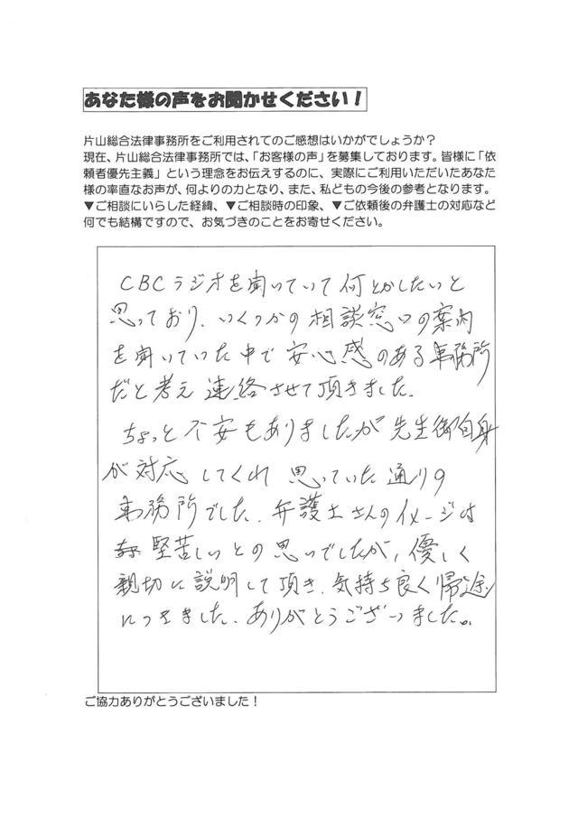 ところが、いつも運転中にCDを聴いているのですが、その時に限ってラジオを聴いてみたくなり、ラジオに切り換えたとたん、片山総合法律事務所の宣伝CMが流れ、すごいタイミングに何かを感じ、相談してみよう!!という気持ちにかられました。
