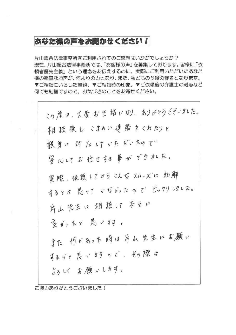 当初の先生の平均的な解決期間よりかなり早く解決して頂き、金額がある程度多かったのですが、なんと満額で和解成立して頂き、感謝の気持ちでいっぱいです。