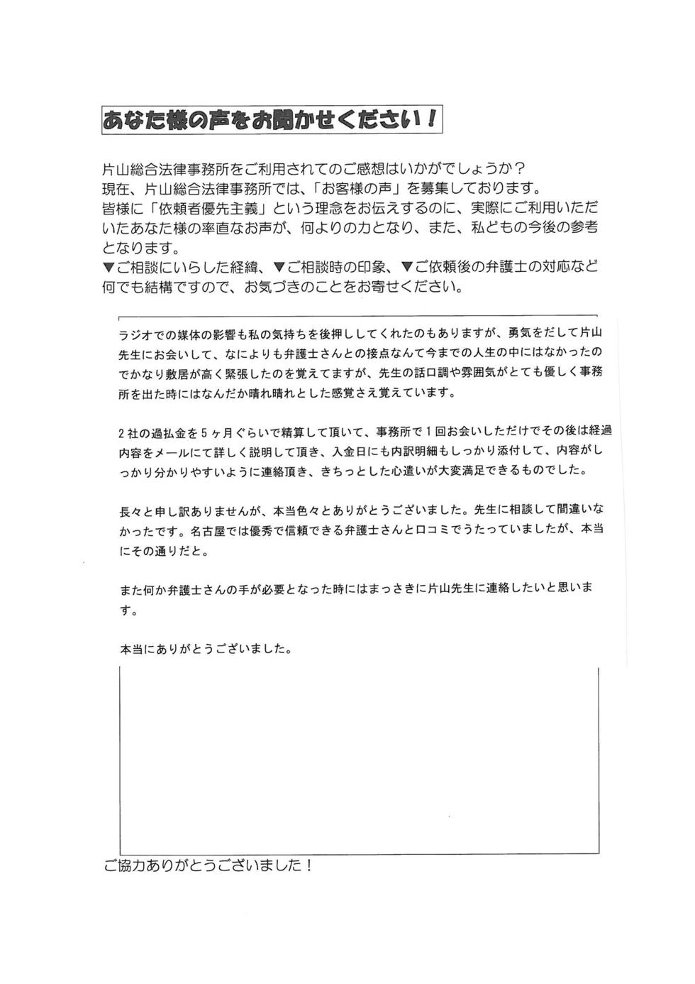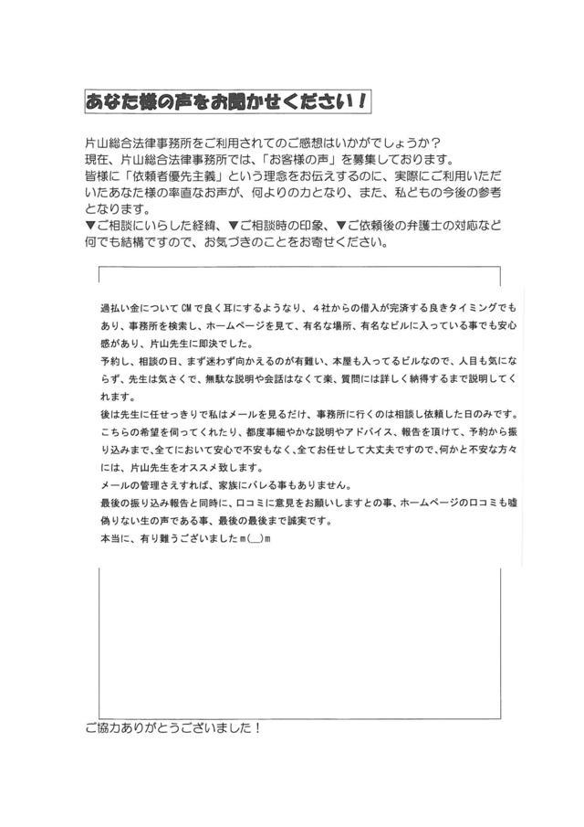 ラジオCM、ホームページ等の印象から、過払い金請求をお願いするなら、片山先生にと決めてお伺いしましたが、初回ご相談時より大変に分かり易いご説明、迅速なご対応により、過払い金請求に対する不安は無くなりました。