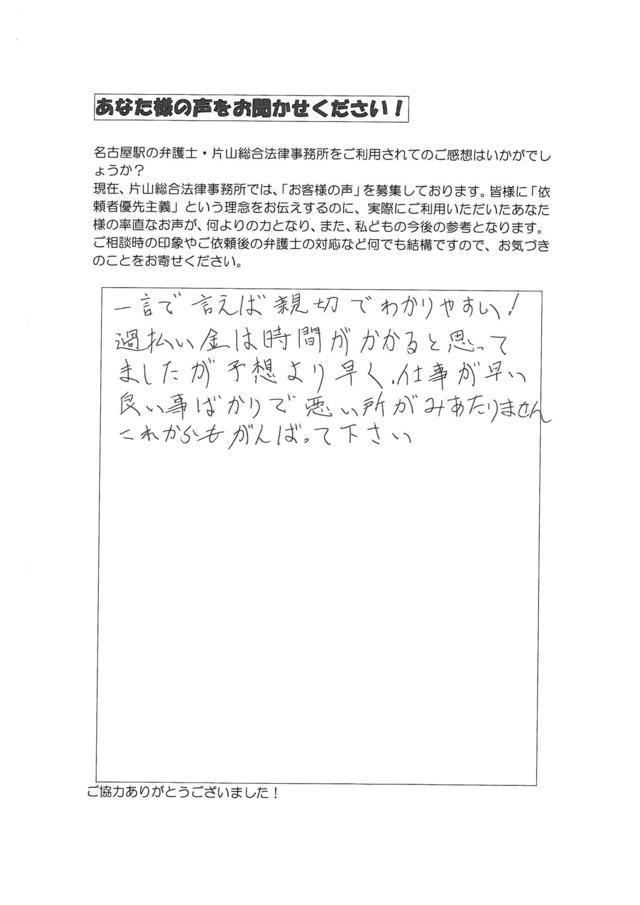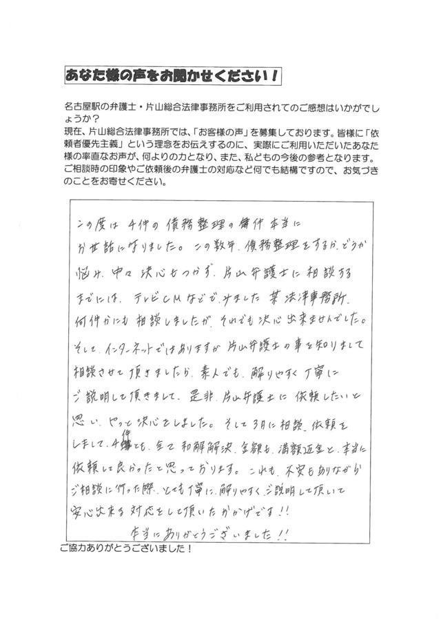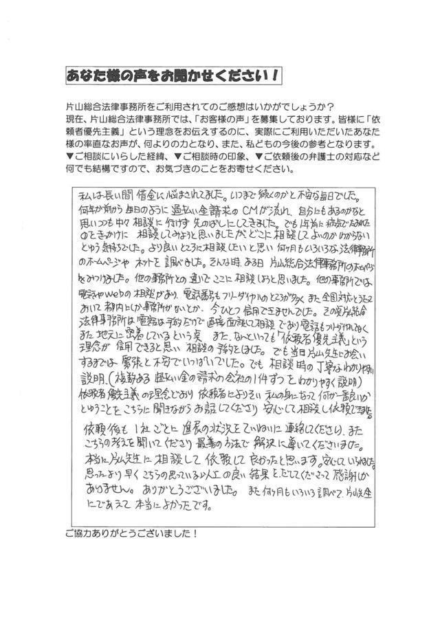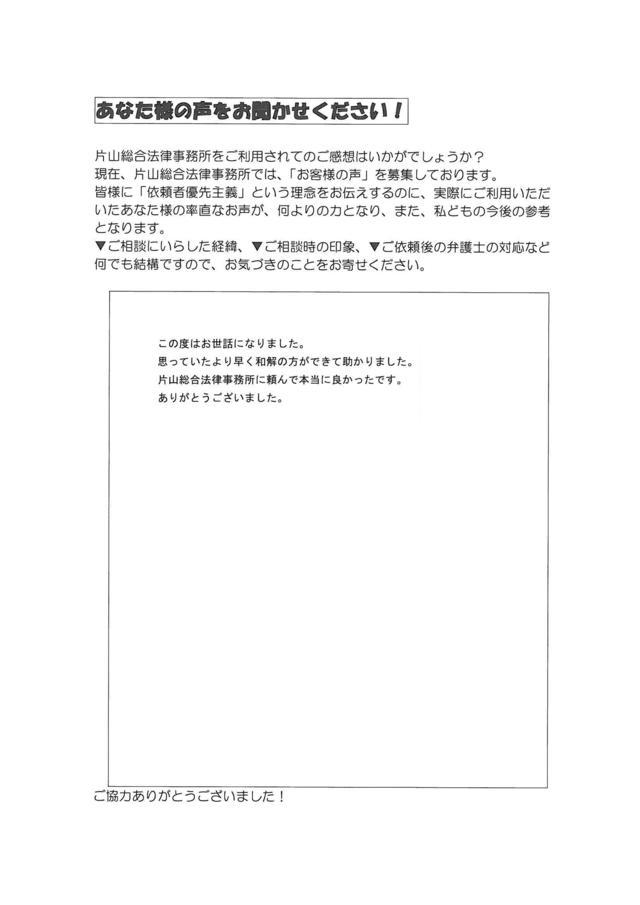 そして、インターネットではありますが、片山弁護士の事を知りまして、相談させて頂きましたら、素人でも解りやすく丁寧にご説明して頂きまして、是非、片山弁護士に依頼したいと思い、やっと決心をしました。