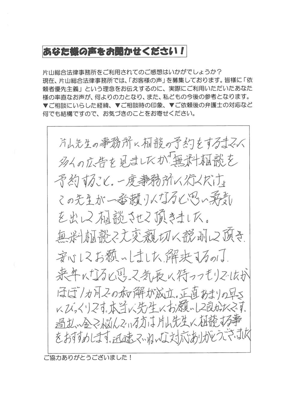 まったく過払金請求に関して無知な私に、丁寧にわかりやすく説明してくださったのが片山先生だったので決めました。