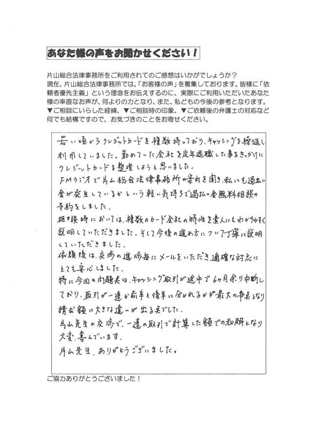 片山先生の東大法学部卒、国営放送の記者だったという輝かしい経歴に少々気後れしましたが、弁護士としての片山先生の理念と過払い金に取り組まれる強い姿勢が、お客様の声にそのまま反映されていて、理念通り依頼者の立場に立って誠心誠意お仕事されているのだと確信し、迷うことなく片山先生にお願いすることに決めました。