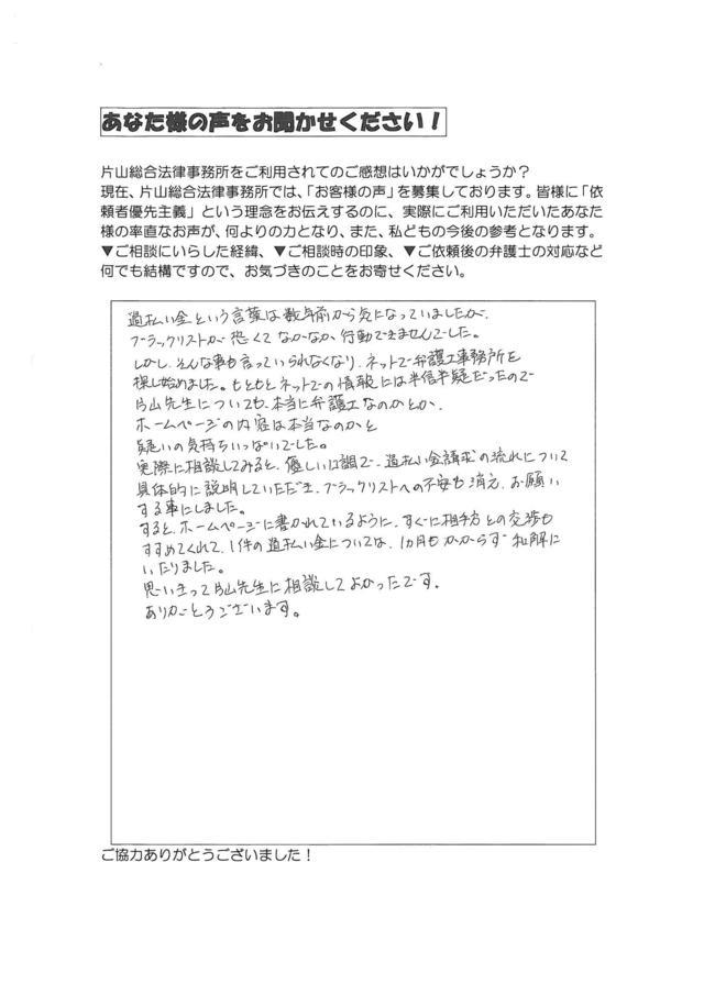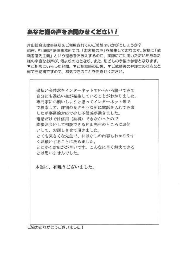 相談前は何か面倒な事にならないか、漠然と不安な気持ちでしたが、手続きについて分かり易く説明していただき、またその時の片山弁護士の印象、人柄から不安はなくなりました。