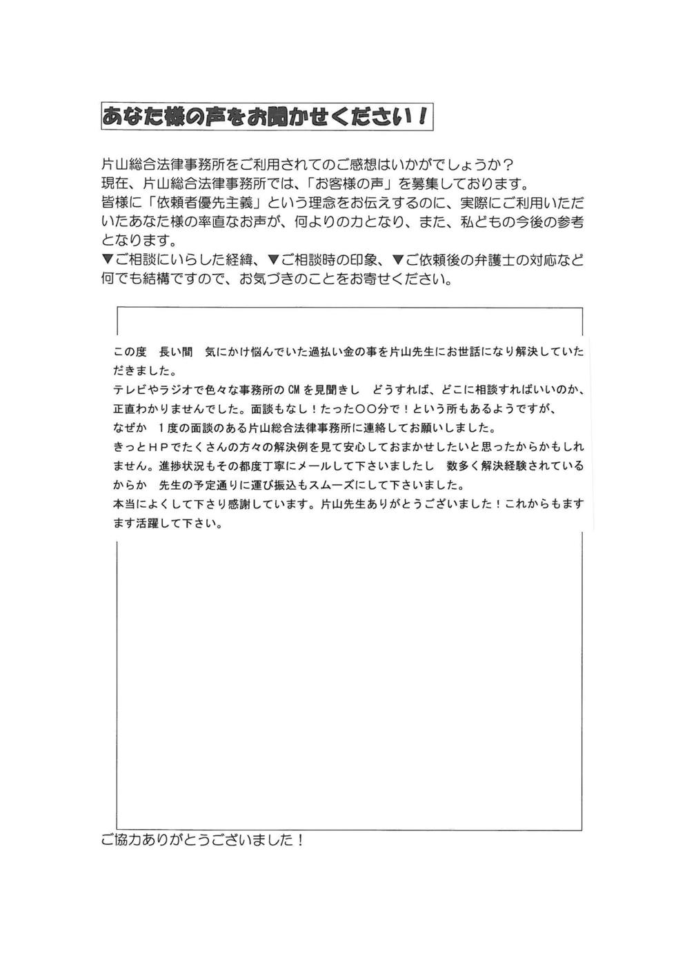 この度 長い間 気にかけ悩んでいた過払い金の事を片山先生にお世話になり解決していただきました。